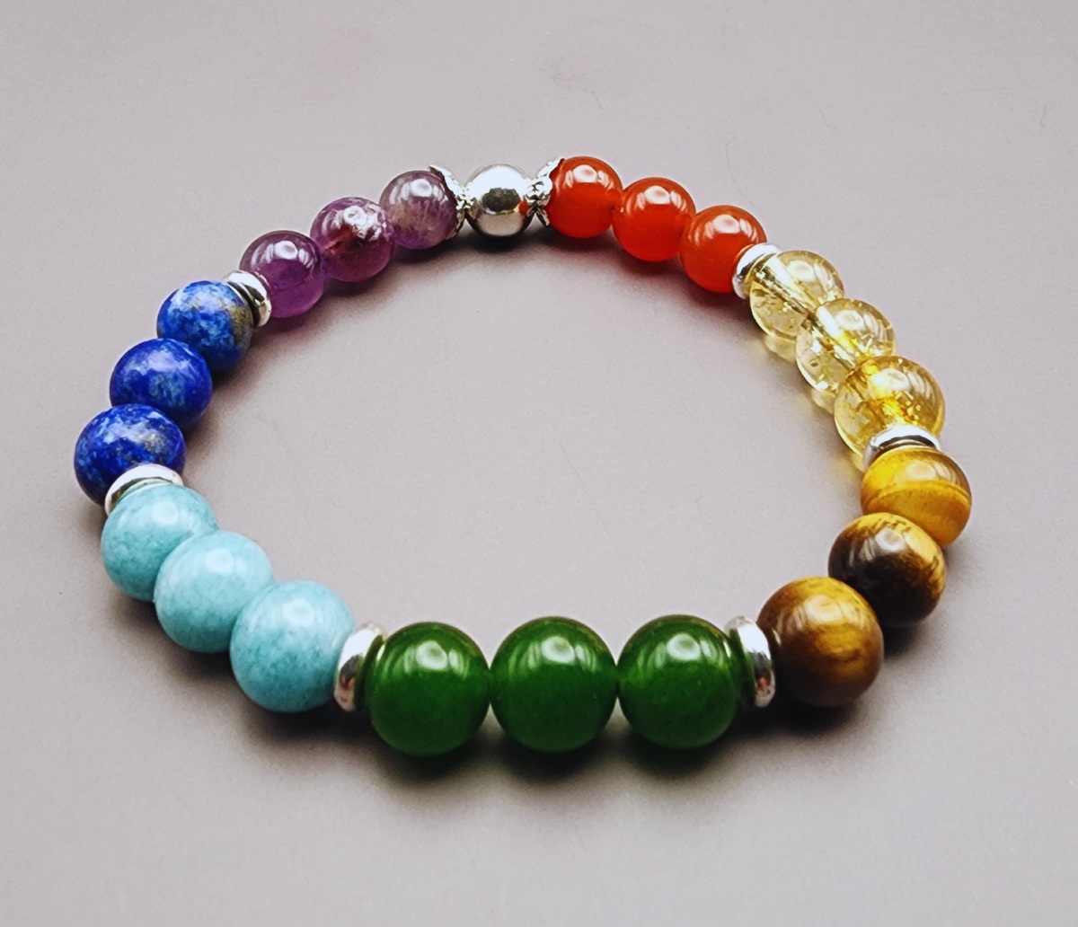 This vibrant energy bracelet features a full array of chakra stones, offering a harmonious flow from root to crown. Each crystal—red carnelian, golden citrine, tiger’s eye, green aventurine, turquoise, lapis lazuli, and amethyst—is carefully selected to activate and balance its corresponding energy center. The absence of grounding stones allows for a lighter, more elevated feel—ideal for meditation, energy work, or emotional attunement. A beautiful tool for aligning mind, body, and spirit.